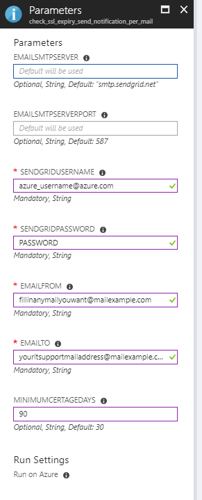 Step 1 Install the runbook using the Azure Automation Runbooks gallery. Search for “Check SSL expiration and notify per mail”.