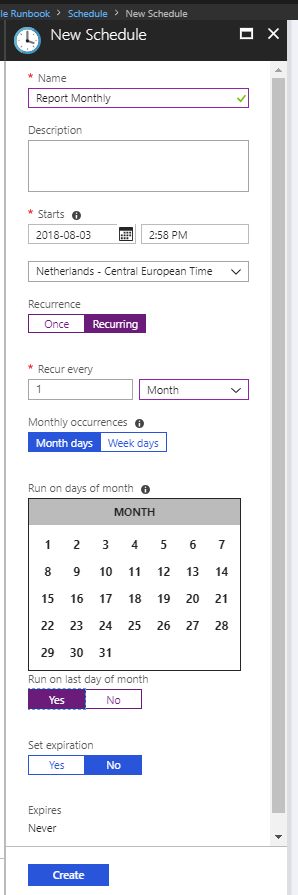 Step 2 Once the runbook has been import, you need to define a schedule. I would advise you to create a recurring schedule and report monthly.